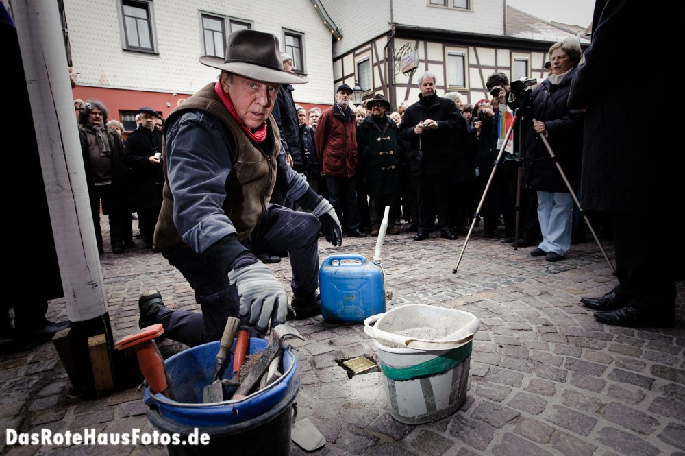 Der Künstler Gunter Demnig verlegt den ersten Stolperstein vor dem Haus Große Gasse 20 in Michelstadt.