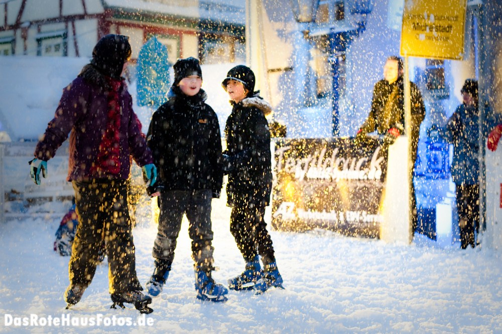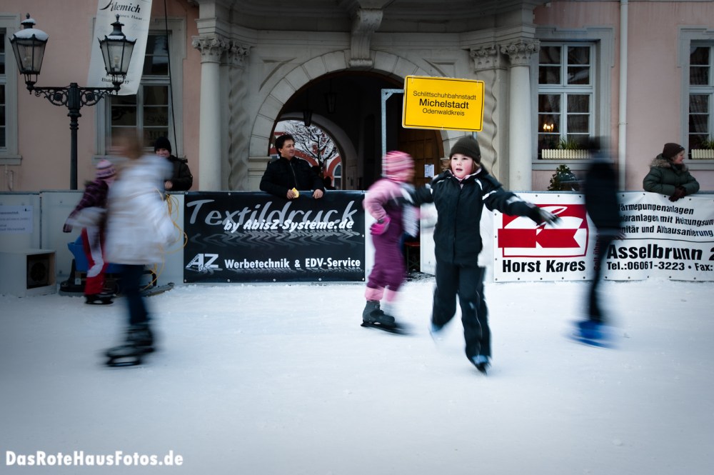 Der Winterhit im tief verschneiten Michelstadt ist die Eislaufbahn auftausichere Schlittschuhbahn aus Kunststoff. Deren Belag ist aber beileibe nicht rutschfest, sondern – wie ich aus eigenem Erleben bezeugen kann – sauglatt. Wenn man nicht aufpasst, liegt man ruck-zuck auf der Nase. Auf einer Echt-Eisbahn geht das auch nicht schneller.